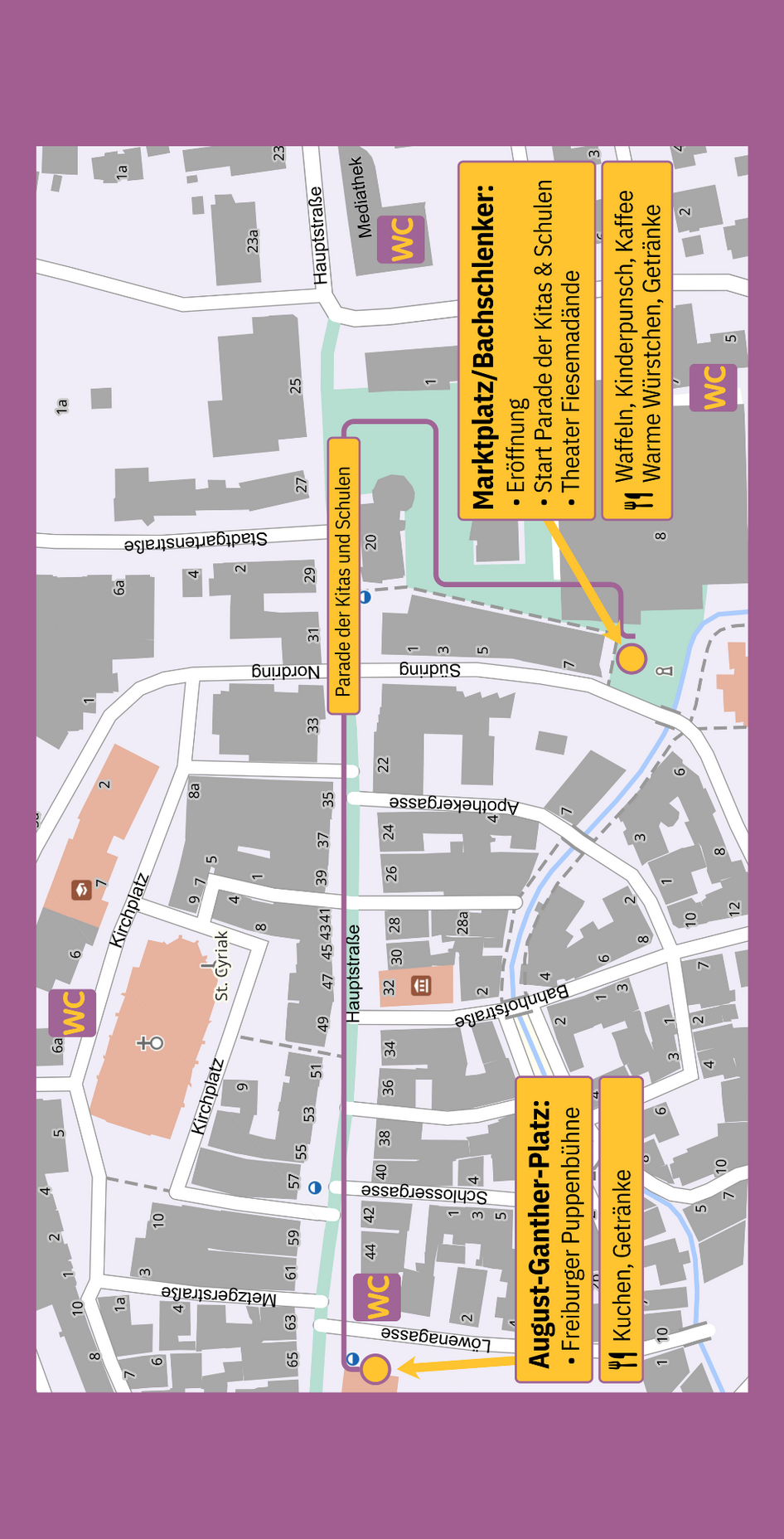 - 11:30 Uhr, Marktplatz / Bachschlenker: Fritz Rasselkopf (Theater Fiesemadände Karlsruhe): Fritz macht Krach. Seine Mutter schickt ihn ohne Essen ins Bett. Weil er so ein Rasselkopf sei, meint sie. Da flitzt Fritz los, um vielleicht noch ein paar weitere Rasselköpfe zu finden. Auf einer Insel kommt es dann zu einer wunderbaren Begegnung.