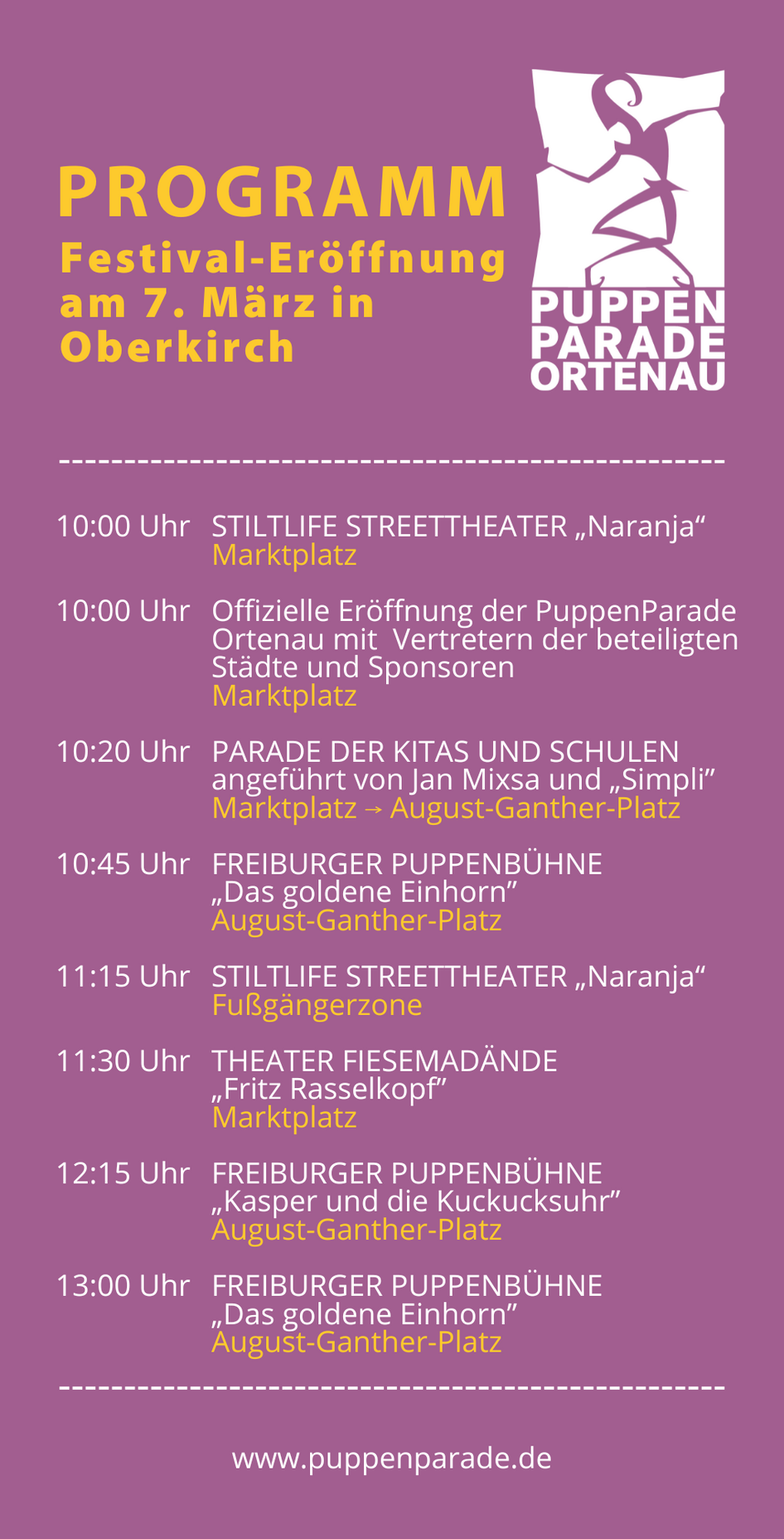 - 10:30 Uhr, Marktplatz / Bachschlenker: Jan Mixsas kunterbunte Parade (Theater Fiesemadände Karlsruhe): Gemeinsam mit Jan, seiner Gitarre, viel Quatsch, Spaß und Musik ziehen alle Besucher des Eröffnungstages der PuppenParade Ortenau zum ersten Theaterstück am August-Ganther-Platz.